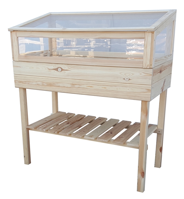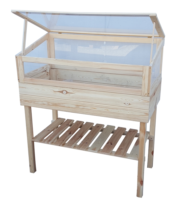 Dieses Hochbeet steht auf stabilen Beinen, damit man bequem im Stehen arbeiten kann. Hergestellt aus massivem und naturbelassenem Kiefernholz bietet dieses Hochbeet zusätzlich auch eine praktische Ablagefläche unter dem Beet. In diesem Set ist zudem ein Aufsatz enthalten, um den Inhalt des Beetes vor äußeren Einflüssen besser schützen zu können. Durch die kompakten Abmessungen eignet es sich auch hervorragend für die Verwendung als Frühbeet auf Balkonen und Terrassen.